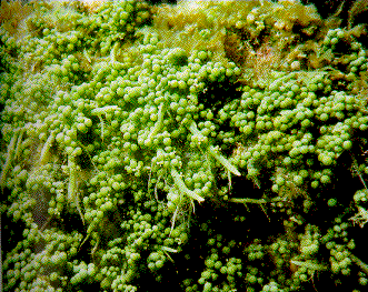 Species form colonies with erect branches and rhizoid bearing stolons. This species is characterized by having stolons of rather coarse and tabular construction; erect branches composed of clusters of club-shaped or spherical filaments. Short forms (3-5 cm) resemble grapes; other varieties with main branches elongate (8-15 cm), and bear the branchlets along their entire length.