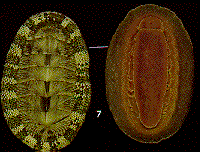 Broadly oval, plates strongly keeled. Each plate divided into a broad triangle toward the front, and 2 wedge-shaped triangles at the sides. Main triangle marked with longitudinal grooves, side triangles bear transverse wavy ridges. Front and back plates pimpled with small tubercles. Colour olive-green, clouded and speckled with greenish. Conspicious girdle heavily scaled; pale green, with squareish patches of black or dark green, suggesting a border of snake skin.