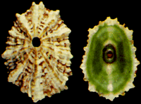 has alternating rings of dull green and white. Occurs in intertidal regions,