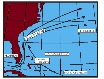 Bermuda is located about 1000 km east-southeast of Cape Hatteras and 1400 km from the nearest coral reefs in the Florida-Bahamas region. It is bathed by the warm waters of the Gulf Stream, where they eddy into the Sargasso Sea, and thus enjoys a sub-tropical climate rather out of place for such a latitude (32 degrees, 20 minutes North).