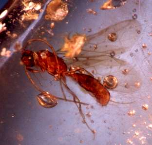 A piece of Madagascar Copal dated between 5 and 20 million years old. The insect seen within is a wasp, family