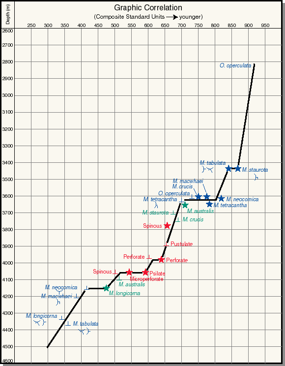 To make a graphing correlation, FAD and LAD data are plotted on a basic X-Y graph. The X axis plots the Standard Reference Section (SRS-the section against which all other sections will be referenced against). The Y axis plots the distance from the base of your column at which either the FAD or LAD appears, relative to the SRS. Dog legs in a graph represent periods of non deposition, also known as a "hiatus".