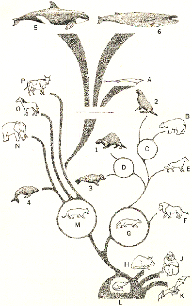 Artiodactyla (even-toed hoof) The terrestrial precursor of the cetacean is the same ancestor of artiodactyls (eg. cows, deer and sheep). This common ancestor was a wolf-like creature called Mesonychid condylarth. Mesonychids were completely terrestrial and their eating habits ranged from carnivorous, herbaceous and omnivorous. Their fossils have been found in estuary and lagoonal sediment deposits suggesting they found food plentiful in the water.(Evans, 1987) Genetic sequencing of mitochondrial b-cytochrome and nuclear material seems to indicate an evolutionary link of modern artiodactyls and cetaceans, although more experimentation must be done. (Adachi & Hasegawa, 1996) |