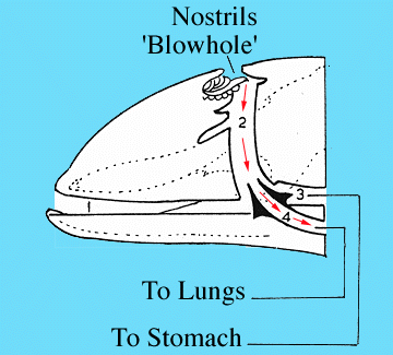 Cetaceans can hold their breath underwater for as long as 15 minutes for a dolphin and up to 75 minutes by a Sperm Whale, if necessary. They begin to exhale just before reaching the surface, inhale above the water (usually taking 3-4 breaths), then close a muscular flap over the blowhole(s) as they submerge again. The nasal passages are not connected to the throat which prevents water entering the lungs when the mouth is open during swimming or feeding. Instead, the air from the blowhole enters directly into the trachea, then to the lungs. Continued... |