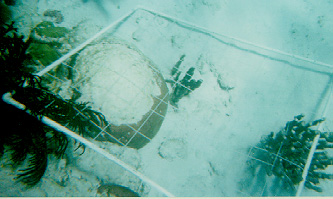 The grid was placed on the edge of a small patch reef (upper right). Clearly visible within the grid is a large (~ 0.5 m in diameter) boulder coral (that is undergoing massive bleaching. Also within the gird are some soft coral that are common around the base of the patch reefs. The second picture (lower right) is of the patch reef beside the grid. Patch reefs are much like the reef crest but they are smaller isolated features.