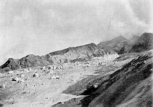 By May 4, the continuous ash fall had caused the Riviere Blanche, the river to the north of St. Pierre, to completely dry up. On May 5, the river became flooded, by an unknown source, and a hot mudflow drove towards the harbour. A sugarmill situated on a bank was buried by the mudslide which killed all the workers inside. The harbour experienced a small tsunami from the flood of mud and water that violently entered the sea. This picture shows the block and ash flows that later filled the valley of the Riviere Blanche.