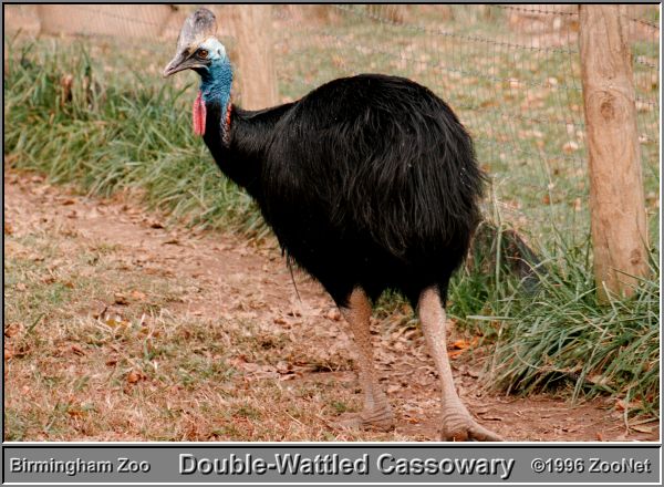 Cassowaries are closely related to emus. The family consists of three species - the Double-wattled, the Single-wattled, and the Dwarf. The Double-wattled cassowary is the largest, standing up to 180 cm tall. The Dwarf cassowary stands a little over 100 cm.