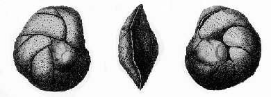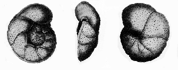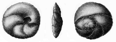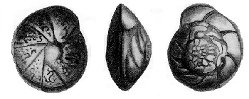 The first illustration on the left shows a biconvex trocospiral test shape belonging to Hoeglundina elegans. Note the intricate ornamentations on the chamber test surfaces. To its right is Cibicides lobatulus displaying an umbilicoconvex trocospiral morphology. The rendering on the bottom left is of the lenticular Cassidulina teretis. The final frame hosts the spiroconvex trocospiral Rosalina williamsoni. (renderings based on: Lipps, J.H. Fossil Prokaryotes and Protists). These last few pages were some of the more common test morphologies seen in foraminifera. They are by no means definitive groupings, but rather each tends to blend into the next. As well they fail to cover the entire spectrum of Foraminiferan test shapes. The next pages is dedicated to morphologies that don't quite fit into the simple divisions defined earlier.