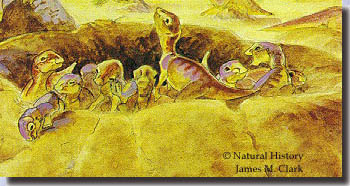 The Maiasaur nest consisted of a hollowed-out bowl about two meters across and one meter deep at the centre and appeared to have been built up from the ground with a rim about 75 centimeters high. They have been fittingly described as miniature volcanoes. |
