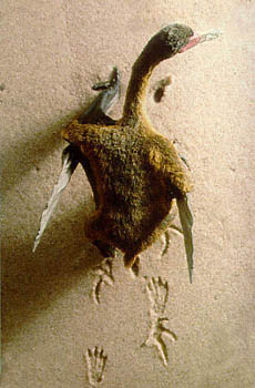 It is likely that Pterosaurs displayed a wide variety of stances and this is reflected in the occurrence in the fossil record of both fused and unfused pelvii. The importance of stance has always been thought to be critical in the interpretation of Pterosaur behavior and locomotive ability; quadrupedal stance was thought to be indicative of ungainly locomotion on the ground, and bipedal stance indicative of superior locomotion. This is probably no longer true, the track ways supporting quadrupedal locomotion indicate that the pterosaur which made them spent a large amount of time on the ground and foraged for food. Whether Pterosaurs were quadrupedal or bipedal is not important when considering the ground locomotive capabilities. Consider the variety of birds and the way in which they move on the ground. The Roadrunner is supremely adapted to running, the loon struggles on land, and vultures waddle ungainly. These same abilities could be reflected in Pterosaurs. |