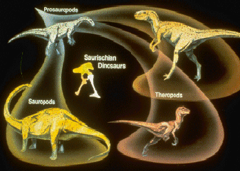 Tyrannosaurus rex is a member of the saurischia or "lizard-hipped" dinosaurs. T.rex can then be classed in the theropods, carnivores that have many hollow bones and walk on their hind legs with three or fewer working toes on each foot. T.rex was one of the biggest theropods, a group that ranged from the chicken sized Compsognathus to dinosaurs as big as forty feet long. T.rex is then placed in the Coelurosaurus group, the closest descedants to modern birds.