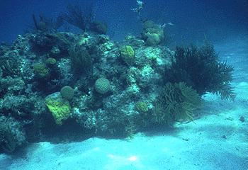 La croissance actuelle de récifs est restreinte à l'ouest de l'île, où un récif peu pentu s'étend jusqu'à 300 mètres de la côte et atteint une profondeur de 10 mètres. On remarque, à partir de ce récif, la formation d'autres récifs en segments étroits, en demi-cercles ou en lames courbées. Ils ne sont pas généralement très bien développés et consistent de roc récifal et de débris coralliens recouverts de Lithothamnion et de poussées cylindriques de Porites porites, de P. astreoides, de Siderastrea siderea et de Millepora alcicornis. Sur le rebord du récif, le fond de mer s'étend jusqu'à environ 20 m de profondeur et ce de façon parallèle à la côte. Il existe aussi un récif submergé dans la mer, de 12 à 20 m de creux et jusqu'à 100 m de large, parallèle à la côte. Il est possible que ce récif, qui s'étend du nord au sud, rejoint un récif le long de la côte sud. Il existe un second récif fossilisé, submergé jusqu'à 70 m de profondeur. |