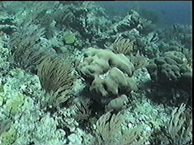 Cette image illustre deux traits de la crête du récif. Premièrement, on remarque la présence de corails individuels. Au centre de l'image, on remarque la tête d'un unique rocher corallien (Porites). Deuxièmement, on peut voir de larges corails tendres. |