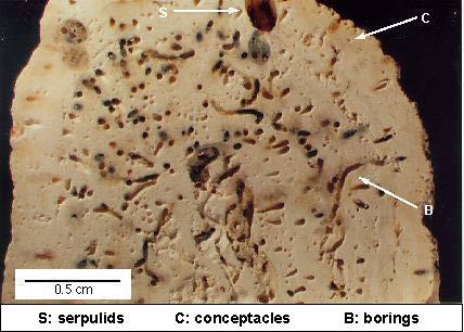 Une coupe transversale d'une rhodophycée qui montre une considérable érosion biologique du noyau. Cette érosion a eu lieu avant l'incrustation.