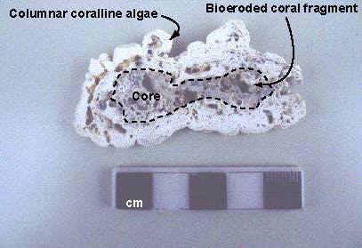 Une coupe transversale d'une rhodophycée. Le noyau est formé d'un morceau de corail qui a été biologiquement érodé. Les algues incrustantes sont cylindriques.