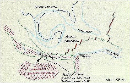 L'élargissement du golfe du Mexique cesse alors que celui du bassin Proto-Caraïbes continu. Une zone en subduction se développe sous la chaîne antillaise, accompagnée par une activité volcanique importante au sud.
