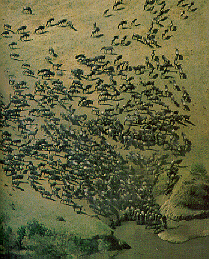 In response to the dry season a herd of wildebeast begin their migration. They must cross a flooding river by swimming.